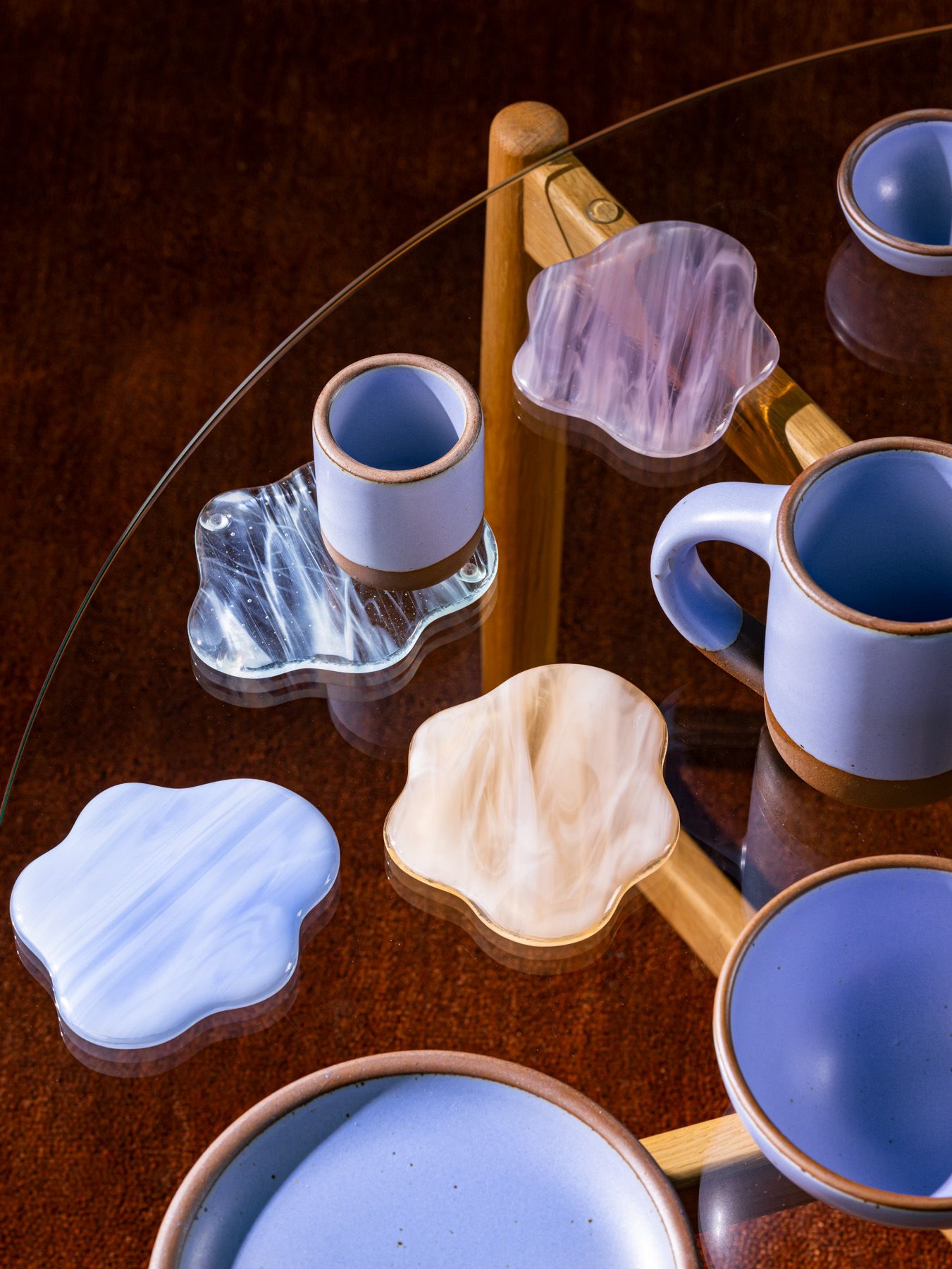 Big Sky is an expansive, cloud-like blue with lavender undertones that reminds us of venturing beyond the ordinary. We love it beside teak flatware, playful ribbed glassware, sliced grapefruit, and our core color, Panna Cotta.