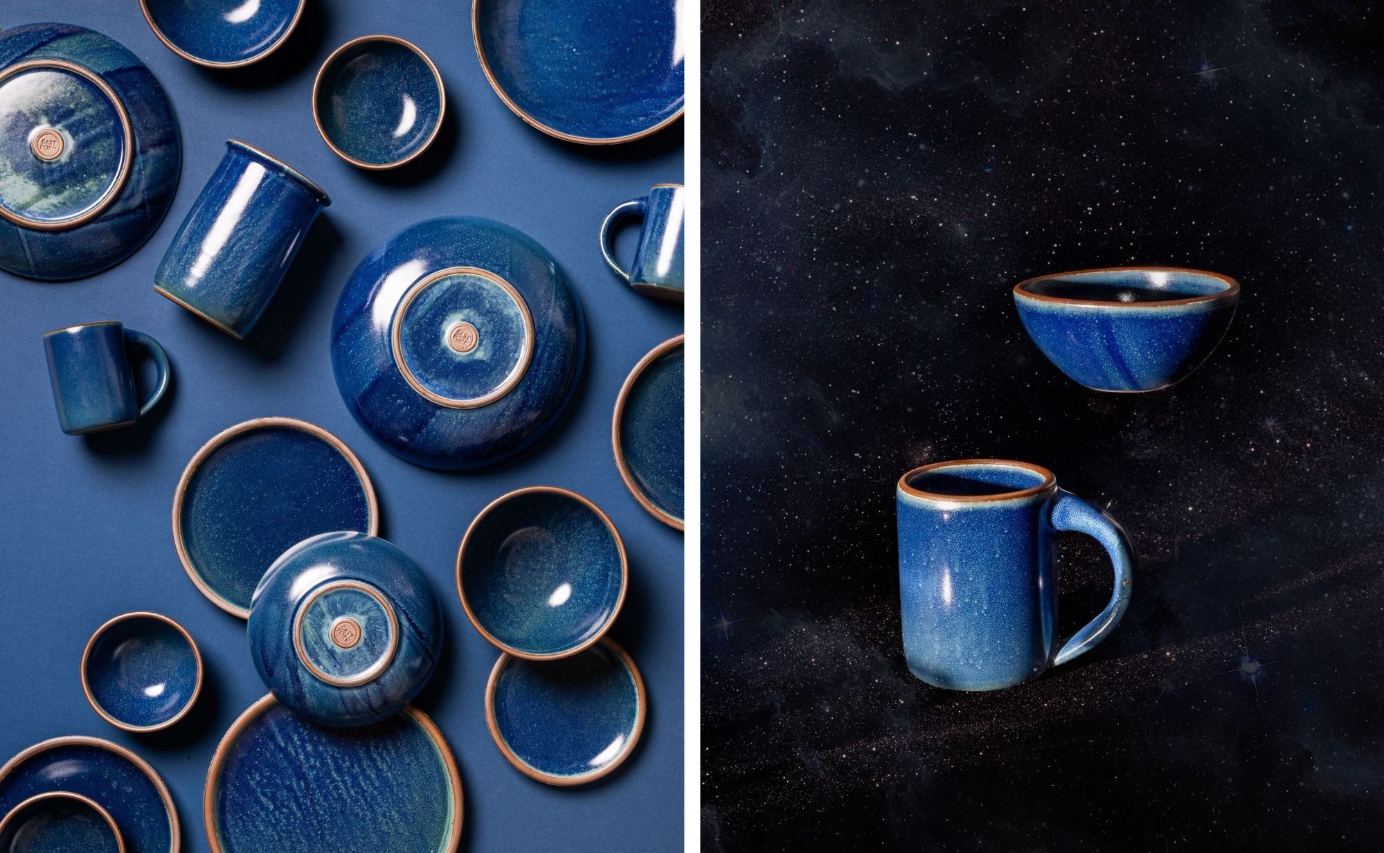 2 images side by side, the first is an artful flat lay of ceramic bowls and pots in a dappled blue glaze; The second is a ceramic bowl and mug in a glossy dappled blue colorway against a dark starry background.