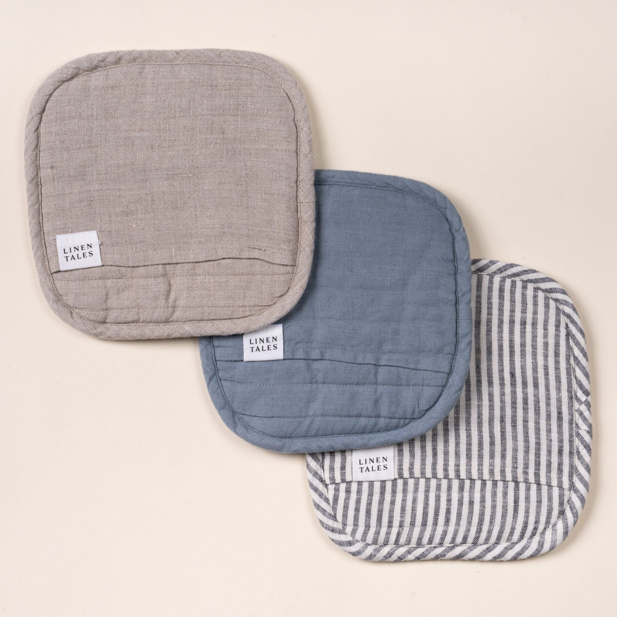 Square quilted linen potholder in a natural color with rounded corners and a small ‘LINEN TALES’ label, on a light background. Hand holds out a square quilted linen potholder in a natural color with rounded corners and a small ‘LINEN TALES’ label, against a light background. Square quilted linen potholder in a natural color with rounded corners and a small ‘LINEN TALES’ label, on a light background. Hand holds out a square quilted linen potholder in a natural color with rounded corners and a small ‘LINEN TALES’ label, against a light background.