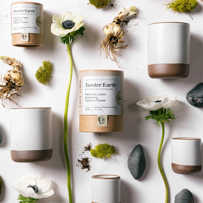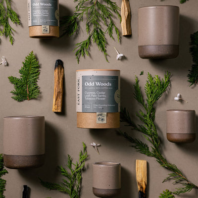 An artful layout of The Candle in Nightcap - centered is a cardboard packaging tube with the candle's name, surrounded by small and large ceramic candles in a cylindrical vessel in a cool terracotta color, surrounded by anise, mint, clove, and bark. Small ceramic vessel in a cool terracotta color with candle inside on a countertop with a potted plant and dish scrub. Small ceramic vessel in a cool terracotta color with candle inside. Small cardboard packaging tube with a candle inside with branding on it that says 'Nightcap' A cylindrical ceramic vessel in a cool terracotta color laying on its side - anise, clove, mint, and bark are artfully styled coming out of the top of the candle to reflect the scent. An artful layout of The Candle in Nightcap - centered is a cardboard packaging tube with the candle's name, surrounded by small and large ceramic candles in a cylindrical vessel in a cool terracotta color, surrounded by anise, mint, clove, and bark. Small ceramic vessel in a cool terracotta color with candle inside on a countertop with a potted plant and dish scrub. Small ceramic vessel in a cool terracotta color with candle inside. Small cardboard packaging tube with a candle inside with branding on it that says 'Nightcap' A cylindrical ceramic vessel in a cool terracotta color laying on its side - anise, clove, mint, and bark are artfully styled coming out of the top of the candle to reflect the scent.